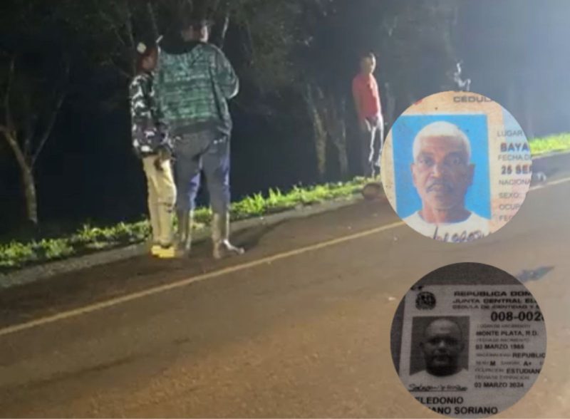 Las víctimas fueron identificadas como Alejandro Concepción Ozoria, conocido como “Comején”, de 71 años de edad, oriundo del municipio Bayaguana, quien falleció en el lugar del accidente a causa de los fuertes golpes recibidos, y Seledonio Soriano Soriano, de 40 años, residente en la comunidad Los Suizos, municipio Monte Plata, quien murió mientras era trasladado en una ambulancia hacia un centro de salud.